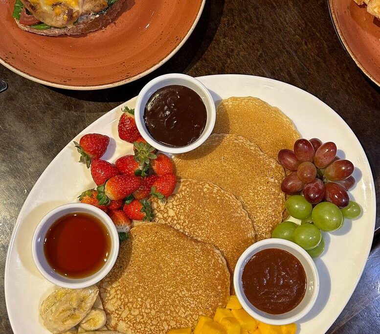 • Panquecas: 4 panquecas artesanais servidas com mix de frutas (banana, morango, uva e manga), guarnecidas com geleia Queensberry, hot fudge e mel