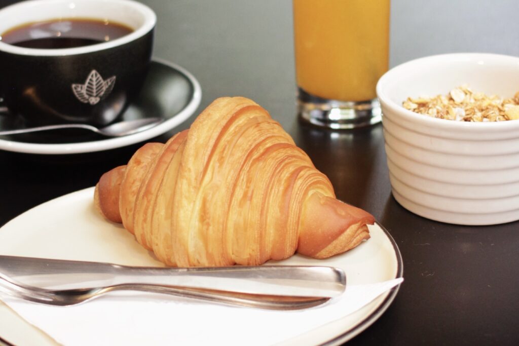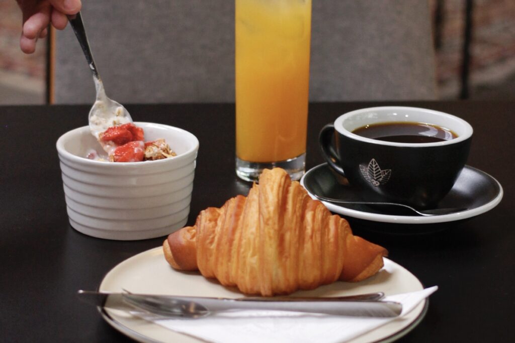 • 1 Croissant simples + 1 iogurte zero lactose com granola e geleia Queensberry + café coado do dia + 1 suco de laranja.