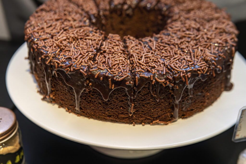 • Bolo de massa escura com cobertura;