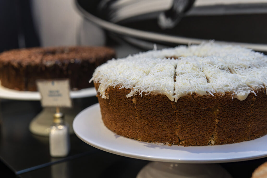 • Bolo de massa clara com cobertura.