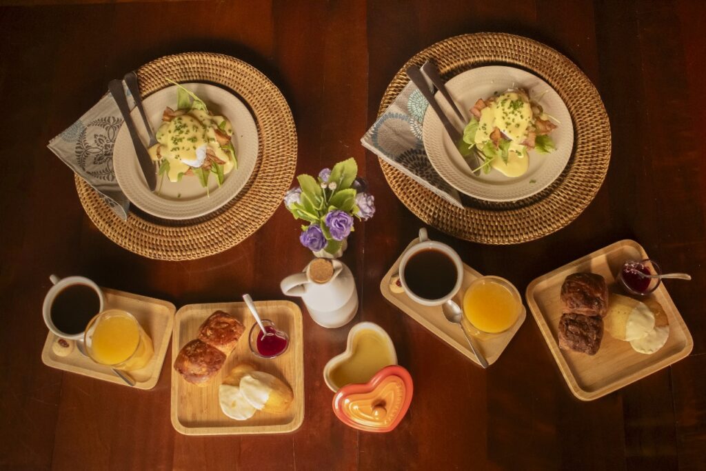 • Pão da casa com ovo Benedict e bacon;