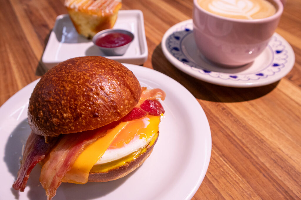 Nosso Sanduíche de Café da Manhã é tudo o que você merece: brioche artesanal fofinho, maionese de cúrcuma, ovo assado no ponto, queijo derretido e bacon artesanal ou cogumelos orgânicos. Pra acompanhar, café especialíssimo Royalty — coado ou capuccino, quente ou gelado, você escolhe. E pra adoçar, muffin delicioso (limão, cenoura ou fubá) servido com geleia Queensberry.